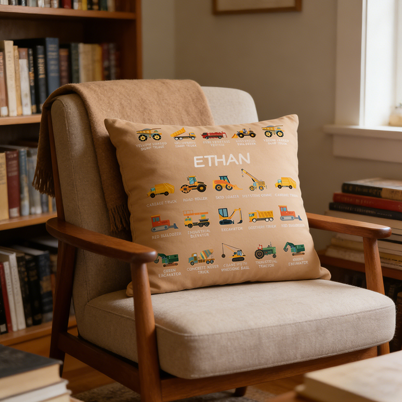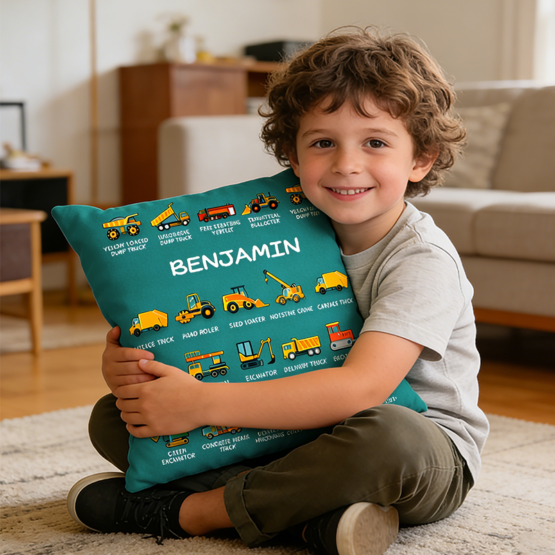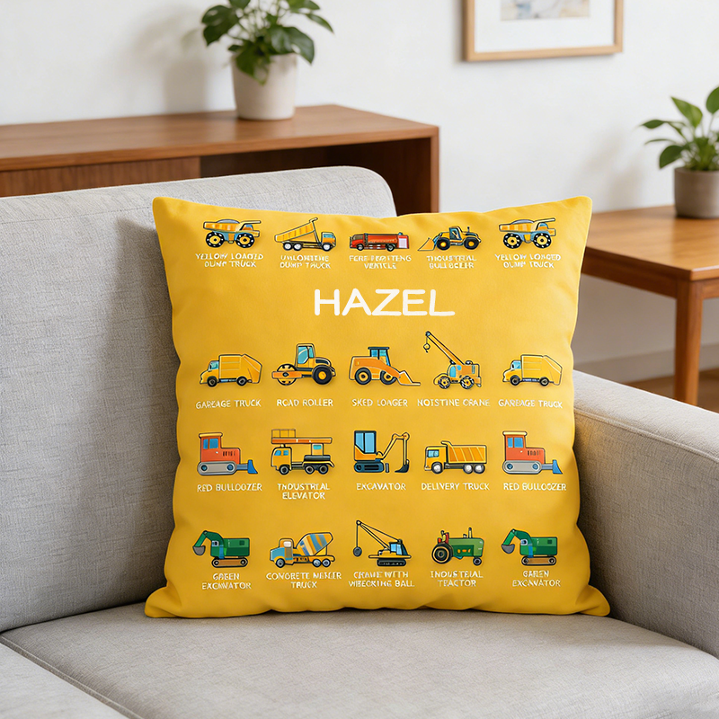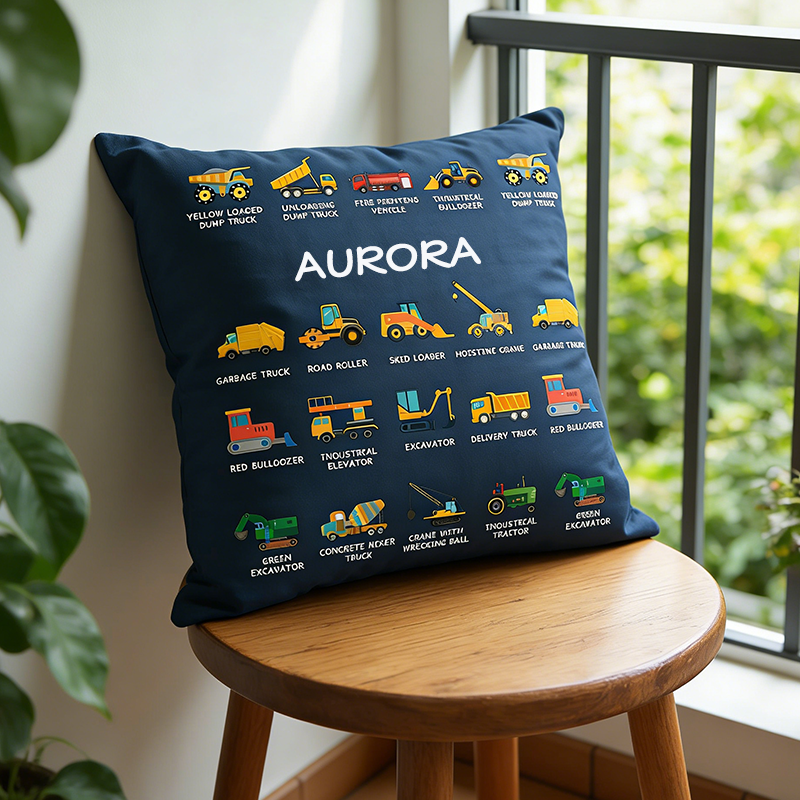 Personalized multi-color construction truck, excavator, and bulldozer throw pillows, with customizable text.