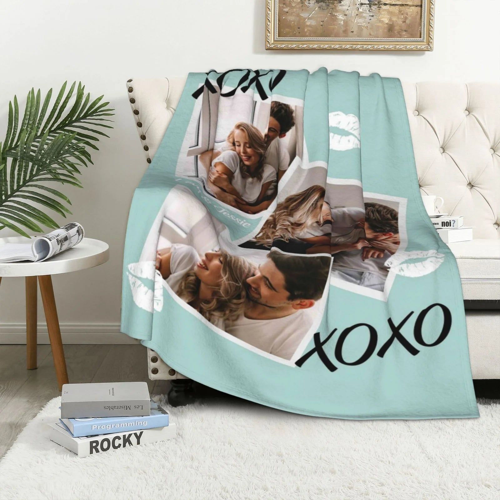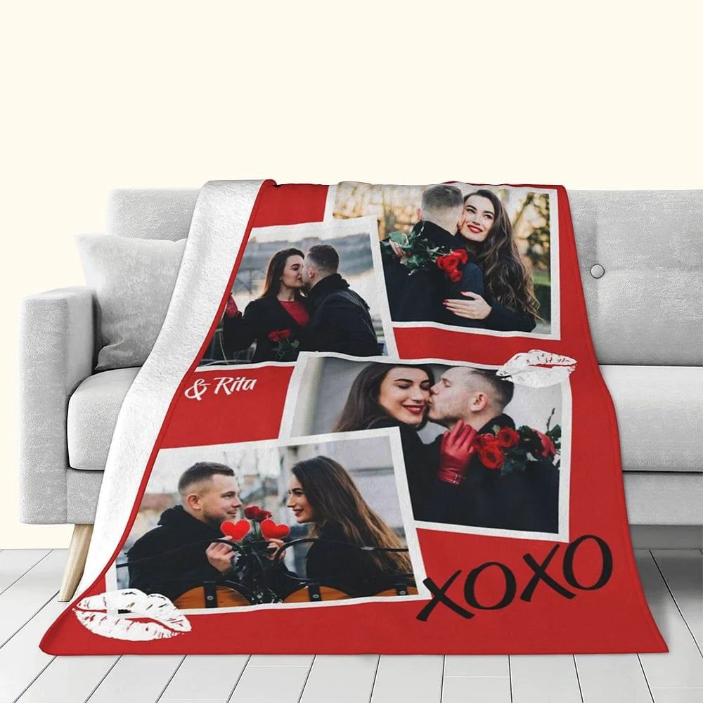 Personalized XOXO Lip Print Photo Collage Fleece Blanket with Couple Names Valentine's Day Anniversary Gift for Couple